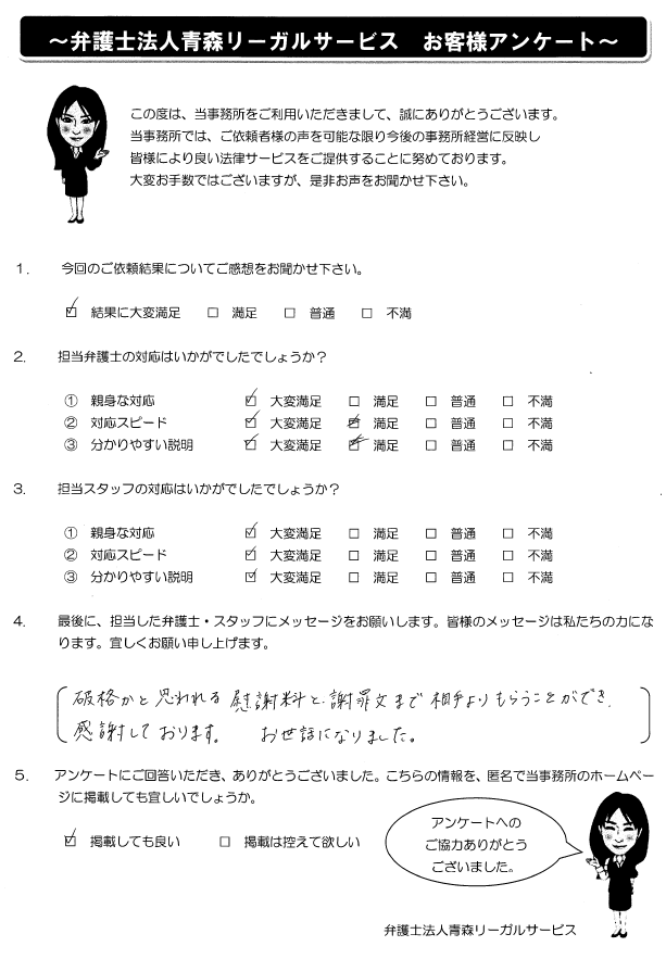 破格かと思われる慰謝料と謝罪文まで相手よりもらうことができ、感謝しております。